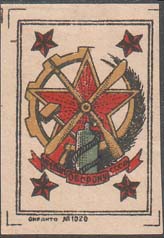 1924(?) г. Круг диаметром 24 мм. Многоцветная печать на белой бумаге. На фоне серпа и молота земной шар и самолет-биплан (вид спереди). Внизу аббревиатура «ОАВУК».