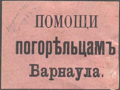1917 г. 01.05.1917 г. Разм. 65 х 49 мм. Одноцветная печать на розовой бумаге. Текст в три строки: «Помощи погорельцам Барнаула».