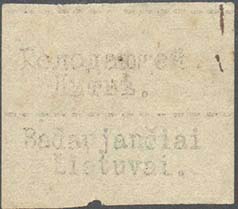1917(?) г. Разм. 39 х 34 мм. Одноцветная печать на тонкой кремовой бумаге. Сверху текст в две строки: «Голодающей Литве». В центре горизонтальная разделительная черта из горизонтальных черточек. Внизу тот же текст в две строки на литовском языке. Знак сбора помощи беженцам из Ковенской губернии, …