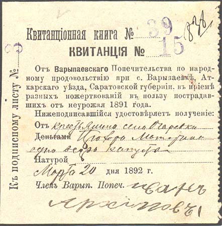 1892 г. Корешок квитанции из квитанционной книжки разм. 74 х 74 мм. Одноцветная печать на белой бумаге. Правосторонняя зубц. 11 1/2. Текст в двенадцать строк: «Квитанционная книга №.. Квитанция №.. От Варыпаевского Попечительства по народному продовольствию при с. Варыпаевке, Аткарского уезда, Са…