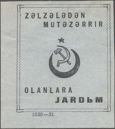 1931 г. Май Разм. 69 х 42 мм. Одноцветная печать на белой бумаге. В прямоугольной рамке разм. 45 х 29 мм текст в четыре строки: «На помощь пострадавшим от землетрясения 10 коп.».