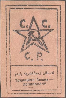 1926(?) г. Разм. 46 х 68 мм. Одноцветная печать розово-серой бумаге. В двойной прямоугольной рамке разм. 39 х 62 мм в центре пятиконечная звезда с серпом и молотом в центре и аббревиатура «С.С.С.Р.». Внизу текст на азербайджанском языке арабской графикой. Внизу текст в две строки: «Трудящиеся Ган…