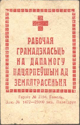 1925 г. Разм. 92 х 60 мм. Одноцветная печать на белой бумаге. В тройной прямоугольной рамке разм. 41 х 63 мм в центре красный крест. Текст в четыре строки: «Красный Крест на помощь пострадавшим от стихийных бедствий». Внизу под рамкой мелким шрифтом выходные данные: «Окрлит. №1230. Гомель. Зак. …