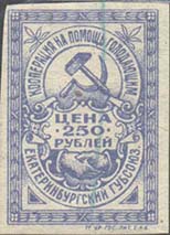 1922 г. Трехцветная печать на белой бумаге. В центре сноп и серп в обрамлении ленты. Текст в две строки: «Подарок голодному». Сверху по углам номинал. Внизу текст: «Примгубкомпомгол».