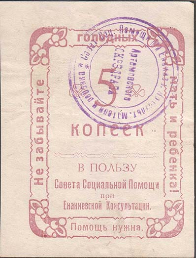1924 г. Одноцветная печать на белой бумаге. В двойной прямоугольной рамке с орнаментом текст в шесть строк: «В пользу Совета Социальной помощи при Енакиевской консультации». Между рамками текст: «Не забывайте голодных мать и ребенка! Помощь нужна». Сверху фиолетовый оттиск круглой печати с неразб…