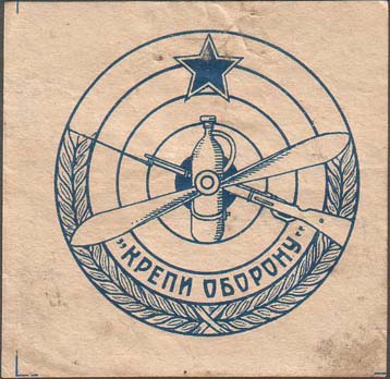 1930(?) г. Разм. 58 х 58 мм. Одноцветная печать на желтоватой бумаге. В центре в круглой раке диаметром 53 мм мишень, в центре которой скрещенные пропеллер, винтовка и баллон с газом. Сверху пятиконечная звезда. Внизу лавровые ветви и текст: «Крепи оборону». По углам знака разграничительные линии.