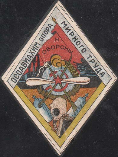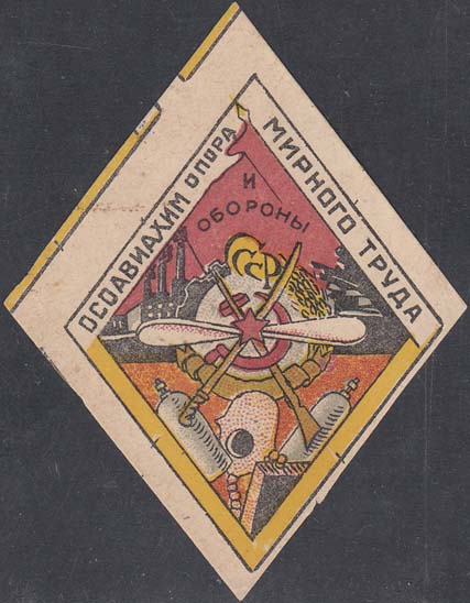 1930(?) г. Ромб разм. 65 х 87 мм. Многоцветная печать на желтоватой бумаге с мелованным верхним слоем. В рамке в форме ромба разм. 59 х 82 мм на фоне индустриального пейзажа в центре стилизованная эмблема ОСОАВИАХИМ. Внизу два газовых баллона и противогаз. Сверху по внутреннему периметру рамки те…
