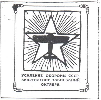 1930(?) г. Разм. рамки 48 х 51 мм. Одноцветная печать на желтой бумаге. В двойной прямоугольной рамке в центре на фоне пятиконечной звезды силуэт самолета. Внизу текст в три строки: «Укрепление обороны СССР закрепление завоеваний Октября».