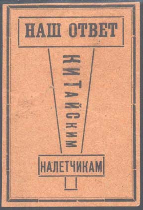 1930(?) г. Разм. рамки 44 х 63 мм. Одноцветная печать на оранжевой бумаге. В двойной прямоугольной рамке в центре стилизованное изображение самолета. На самолете текст: «Наш ответ китайским налетчикам».