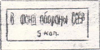 1932 г. Разм. рамки 49 х 19 мм. Одноцветная печать на тонкой серой бумаге. В прямоугольной рамке в центре текст: «В фонд обороны СССР». Внизу номинал.