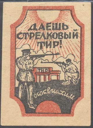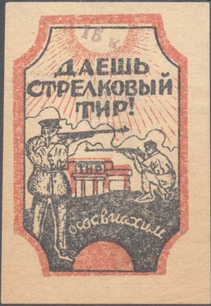 1932 г. Разм. 50 х 72 мм. Двухцветная печать на белой бумаге. В прямоугольной рамке со срезанными по дуге углами в центре здание тира и два стрелка на фоне лучей солнца и облаков. Сверху текст в три строки: «Даешь стрелковый тир». Внизу текст полукругом: «ОСОАВИАХИМ».