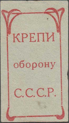 1932(?) г. Разм. 44 х 78 мм. Одноцветная печать на серо-зеленоватой бумаге. В центре в прямоугольной рамке разм. 35 х 67 мм с декоративными элементами по углам текст в три строки: «Крепи оборону С.С.С.Р.».
