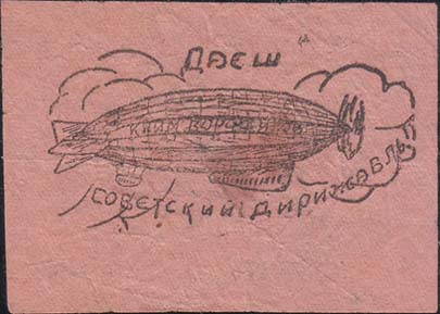 1932(?) г. Разм. 68 х 48 мм. Одноцветная печать низкого качества на тонкой розово-серой бумаге. В центре дирижабль «Клим Ворошилов» в облаках. Сверху текст: «Даешь». Внизу полукругом продолжение текста: «Советский дирижабль».