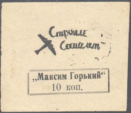 1933 г. Разм. рамки 76 х 68 мм. Одноцветная печать на белой бумаге. В центре силуэт многомоторного самолета. Справа текст в две строки: «Строим самолет». Внизу в двойной прямоугольной рамке разм. 51 х 15,5 мм продолжение текста: ««Максим Горький» 10 коп.».