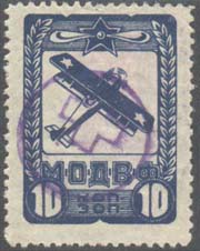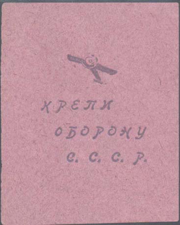 1933(?) г. Разм. 61 х 75 мм. Одноцветная печать на розовой бумаге с темными вкраплениями. Сверху силуэт самолета-моноплана. Внизу текст в три строки: «Крепи оборону С.С.С.Р.».