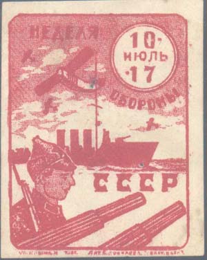 1933(?) г. Разм. рамки 44 х 57 мм. Одноцветная печать на белой бумаге. В рамке с закругленными краями в центре красноармеец с винтовкой, стволы орудий и эсминец. В небе четыре самолета. В правом верхнем углу в двойной круглой рамке дата: «10-17 Июль». Текст в три строки: «Неделя обороны СССР». Вн…