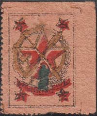 1933 г. Разм. рамки 23 х 32 мм. Многоцветная печать на желтоватой рыхлой бумаге низкого качества. Зубц. 11 1/2. В двойной прямоугольной рамке эмблема ОСОАВИАХИМ. По углам пятиконечные звезды. На оборотной стороне фиолетовый оттиск прямоугольного штампа с вертикальным неразборчивым текстом и номи…