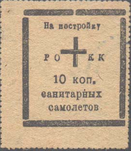 1930(?) г. Разм. рамки 36 х 41 мм. Одноцветная печать на желтоватой бумаге низкого качества. Зубц. 11. В центре эмблема Красного Креста и аббревиатура «РОКК». Ниже номинал. Сверху текст: «На постройку». Внизу продолжение текста в две строки: «Санитарных самолетов». На обороте фрагмент синего отти…