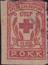 1930(?) г. Одноцветная и двухцветная печать на серой бумаге низкого качества. В рамке сверху текст: «Крепи сан[итарную]. Оборону СССР». В центре красный крест в обрамлении венка из колосьев пшеницы и номинал. Внизу буквы: «Р.О.К.К.».