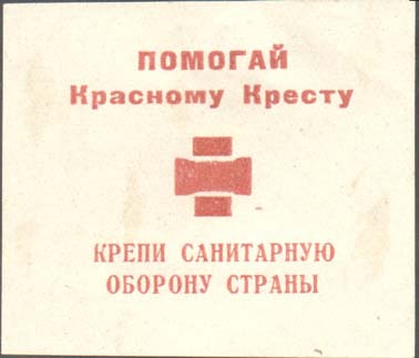 1930(?) г. Разм. 49 х 41 мм. Одноцветная печать на желто-ватой бумаге. В центре красный крест. Сверху текст в две строки: «Помогай Красному Кресту». Внизу текст в две строки: «Крепи санитарную оборону страны».