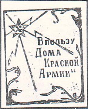 1925(?) г. Разм. рамки 46 х 55 мм. Одноцветная печать на кремовой бумаге. В прямоугольной декоративной рамке с декоративным растительным орнаментом в центре текст в четыре строки: «В пользу дома Красной Армии». В левом верхнем углу пятиконечная звезда с лучами.