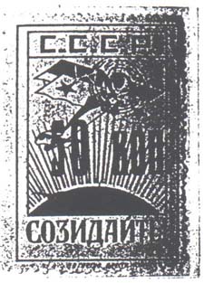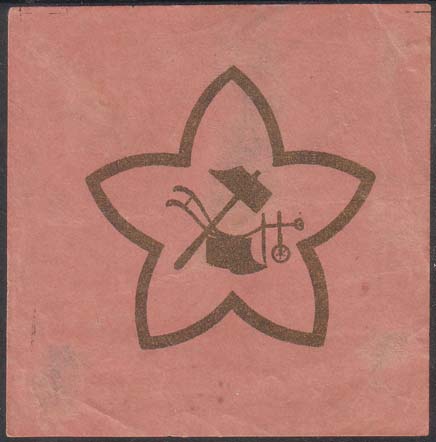 1920(?) г. Разм. 71 х 72 мм. Одноцветная печать на тонкой розово-серой бумаге. В центре пятиконечная звезда с плугом и молотом.