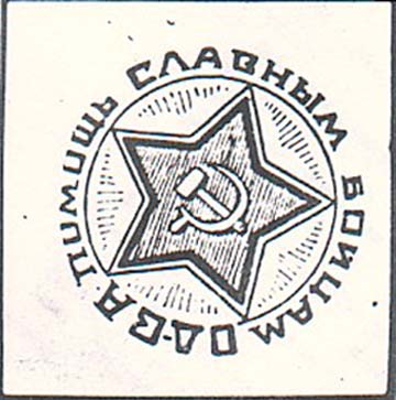 1933 г. Разм. 59 х 59 мм. Одноцветная печать на белой бумаге. В центре в круглой рамке диаметром 38 мм в центре красная звезда с серпом и молотом. По окружности текст: «Славным бойцам ОД-ВА».