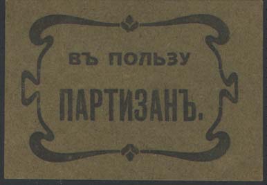 1918 г. Разм. 65 х 45 мм. Одноцветная печать на темно-зелено-серой бумаге. В центре в декоративной рамке текст в две строки: «В пользу партизан».