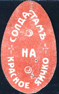 1915(?) г. Виньетка в форме яйца разм. 31 х 52 мм. Одноцветная печать на белой бумаге. По периметру текст: «Солдатам на красное яичко».