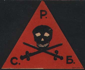 1917 г. 24.09.1917 г. 1917 г. (24.09.1917 г.). Треугольник разм. 56 х 46 мм. Двухцветная печать на желтоватой бумаге. В центре череп и два скрещенных меча. По углам буквы: «Р.С.Б.».