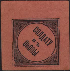 1917 г. 10.12.1917 г. Ромб разм. 65 х 65 мм. Одноцветная печать на розовой бумаге. В центре в рамке в форме ромба разм. 54 х 45 мм двойная круглая рамка диаметром 27 мм. В круге текст в три строки: «Солдату в окопы». Существует два типа клише, отличающихся высотой букв текста.