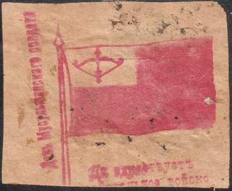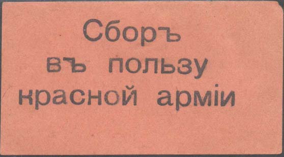 1918 г. 12.03.1918 г. Разм. 93 х 51 мм. Одноцветная печать на розово-красной бумаге. Текст в три строки: «Сбор в пользу красной армии».