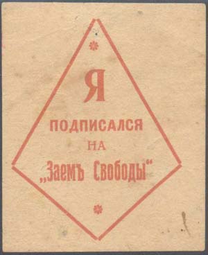 1917 г. Разм. 50 х 61 мм. Одноцветная печать на желтоватой бумаге. В центре в рамке в виде неравностороннего ромба разм. 42 х 54 мм текст в четыре строки: «Я подписался на «Заем Свободы»». Сверху и снизу декоративные элементы.