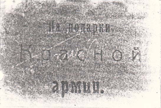 1922(?) г. Разм. 93 х 51 мм. Одноцветная печать на малиново-красной бумаге. В центре текст в три строки: «На подарки Красной армии».