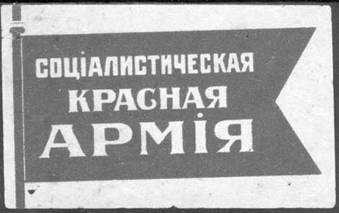 1920(?) г. Разм. 78 х 48 мм. Одноцветная печать на желтоватой бумаге. Красный флаг с вырезом справа в форме фестона. На флаге текст в три строки: «Социалистическая Красная Армия».