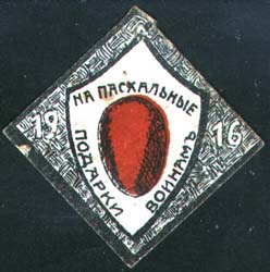 1916 г. Ромб разм. 41 х 41 мм. Двухцветная печать на толстой белой бумаге. В центре фигурный щиток разм. 22 х 32 мм. На щитке пасхальное яйцо и текст: «На пасхальные подарки воинам». По бокам щитка дата: «1916».