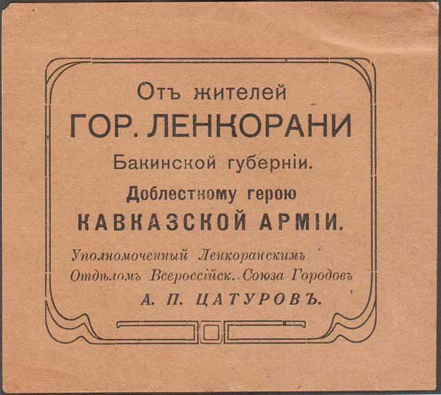 1915(?) г. Разм. 82 х 72 мм. Одноцветная печать на бумаге различных цветов. В центре в декоративной рамке с закругленными краями текст в восемь строк: «От жителей гор. Ленкорани Бакинской губернии. Доблестному герою Кавказской армии. Уполномоченный Ленкоранским Отделом Всероссийск[ого]. Союза Гор…