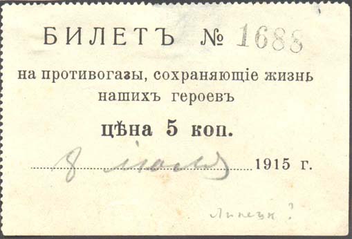 1915 г. Разм. 85 х 57 мм. Одноцветная печать на белой бумаге. Зубц. 11 1/2. Текст в пять строк: «БИЛЕТ №... на противогазы, сохраняющие жизнь наших героев Цена 5 коп. ...(Дата) 1915 г.».
