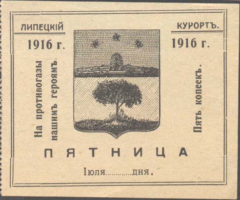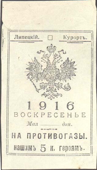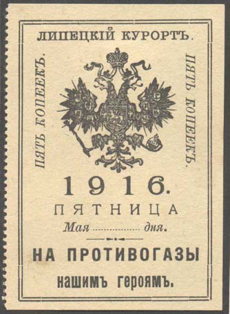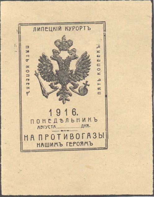 1916 г. Май. Разм. рамки 47 х 69 мм. Одноцветная печать на белой бумаге. В двойной прямоугольной рамке в центре герб России. Внизу текст в пять строк: «1916. ВОСКРЕСЕНЬЕ Мая ... дня. На противогазы нашим 5 к. героям». Сверху текст: «Липецкий Курорт».