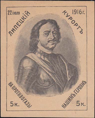 1916 г. Июль Разм. рамки 55 х 70 мм. Одноцветная печать на бумаге различных цветов. Портрет Петра I в доспехах. Сверху текст: «22 июля 1916 г.». Вокруг портрета текст: «Липецкий курорт на противогазы нашим героям».