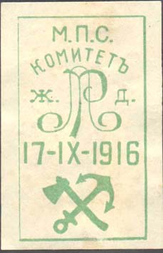 1916 г. 17.09.1916 г. Разм. рамки 30 х 52 мм. Одноцветная печать на белой бумаге. В рамке текст в четыре строки: «М.П.С. Комитет Л.Р.Ж.Д. 17/IX.1916». Внизу путейский значок.
