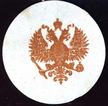 1915(?) г. Круг диаметром 60 мм. Одноцветная печать на белой бумаге. В центре герб России.