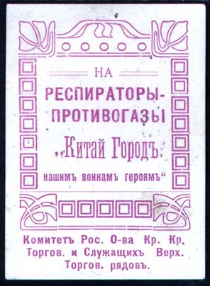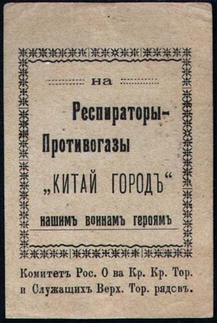 1915 г. 23.-26.06.1915 г. Разм. 51 х 75 мм. Одноцветная печать на зеле-но-серой бумаге. В центре в декоративной рамке разм. 40 х 50 мм текст в пять строк: «На респираторы-противогазы «Китай Город нашим воинам героям»». Внизу под рамкой текст в две строки: «Комитет Рос[сийского]. О-ва Кр[асного]. К…