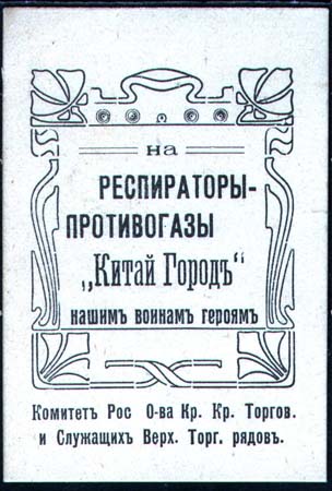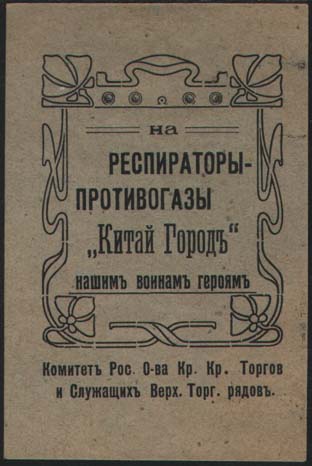 1915 г. 23.-26.06.1915 г. Разм. 34 х 67 мм. Одноцветная печать на глянцевой бумаге различных цветов. В центре в декоративной рамке разм. 40 х 50 мм текст в пять строк: «На респираторы-противогазы «Китай Город нашим воинам героям»». Внизу под рамкой текст в три строки: «Комитет Рос[сийского]. О-ва …