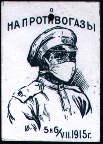 1915 г. 05.-06.07.1915 г. Разм. 34 х 48 мм. Одноцветная печать на толстой белой бумаге. В центре солдат в противогазной маске. Сверху текст: «На противогазы». Выше кружок для отметки места пробивки отверстия. Внизу дата: «5 и 6 /VII 1915 г.». Слева внизу мелкими буквами инициалы художника: «А.К.».
