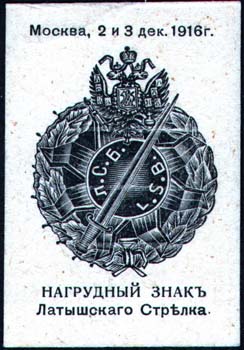 1916 г. 02.-03.01.1916 г. Разм. 41 х 58 мм. Одноцветная печать на толстой плотной сероватой бумаге. В центре нагрудный знак Латышского Стрелка. Сверху текст: «Москва, 2 и 3 дек[абря]. 1916 г.». Внизу текст в две строки: «Нагрудный знак Латышского Стрелка».