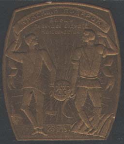 1919 г. Виньетка сложной формы разм. 42 х 48 мм. Одноцветная печать на плотной желтоватой бумаге с тиснением. В центре крестьянин и рабочий с серпом и молотом в руках на фоне солнца. Сверху на ленте текст: «Красный подарок». Ниже текст в три строки: «Борцу за лучшее будущее человечества». Внизу д…