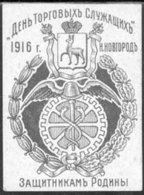 1916 г. Разм 35 х 47 мм. Двухцветная печать на толстой сероватой бумаге с фоном. В центре эмблема торгово-промышленной палаты(?) в обрамлении венка. Сверху герб Нижнего Новгорода. Текст: ««День торговых служащих» 1916 г. Н.Новгород. Защитникам Родины».