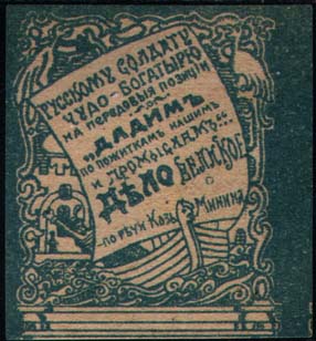 1916(?) г. Разм. 47 х 58 мм. Одноцветная печать на бумаге различных цветов. В декоративной рамке ладья на фоне собора. На парусе ладьи сверху текст в три строки: «Русскому солдату – чудо-богатырю на передовые позиции». Ниже текст в пять строк: ««Дадим по пожиткам нашим и промыслам... Дело великое…