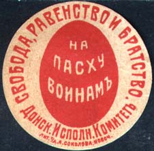1917 г. Круг диаметром 37 мм. Одноцветная печать на желтоватой бумаге. В центре пасхальное яйцо, на котором текст в три строки: «На пасху воинам». По окружности текст: «Свобода, Равенство и Братство. Донск[ой]. Исполн[ительный]. Комитет». Внизу полукругом выходные данные мелким шрифтом: «Лит. Т/…